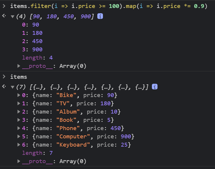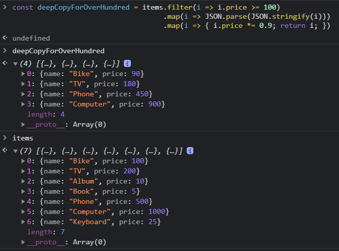 원본 배열에서 100원이 넘는 요소들만 10%할인처리를 한 것이니까 말이다.
