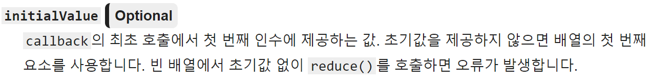// reduce는 예외적으로 첫번째, 두번째가 필수 요소이다.