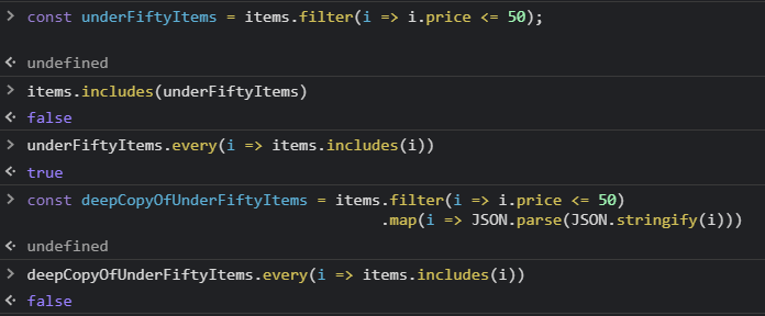 원본 배열의 일부 요소를 깊은 복사한 새로운 배열이 원본 배열에 포함되는지 확인한다면 어떨까?