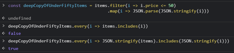 세번째 줄에서 깊은 복사 이후에 부모 배열에 포함되는지 확인을 시도해서 true가 반환됐다.