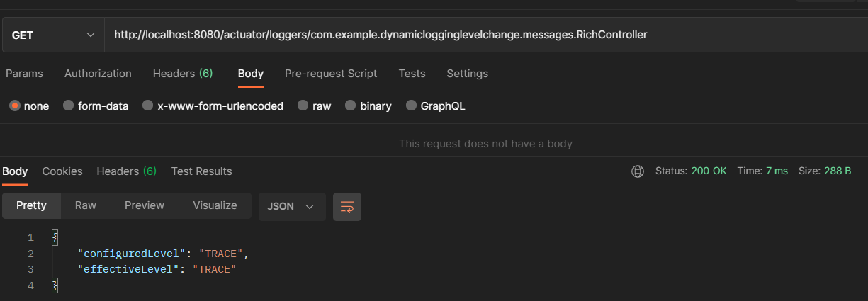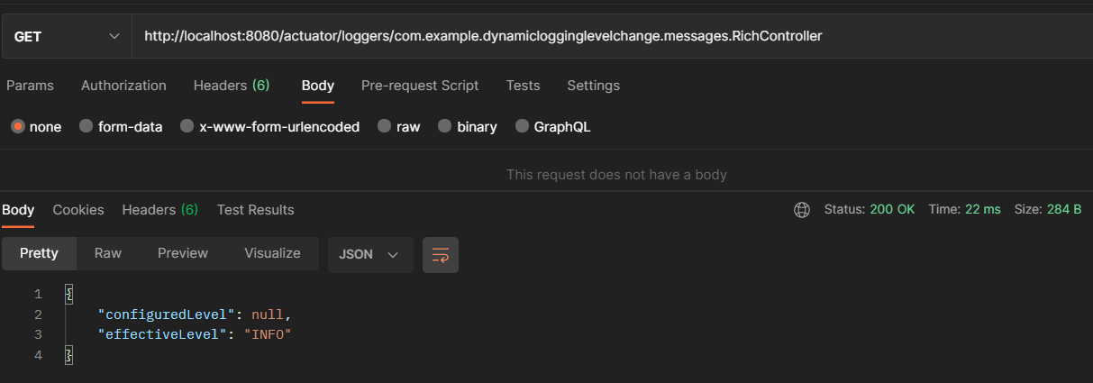 GET : http://localhost:8080/actuator/loggers/com.example.dynamiclogginglevelchange.messages.RichController