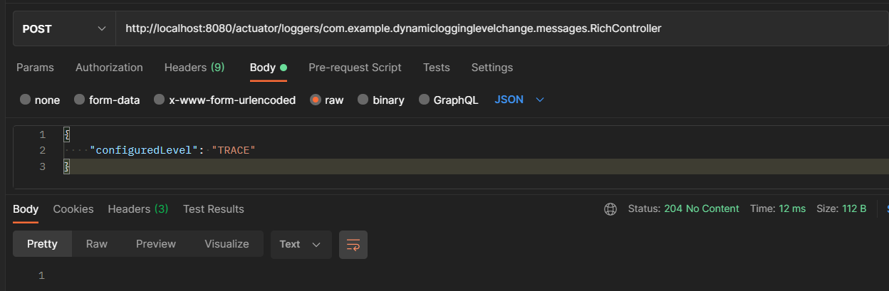 POST : http://localhost:8080/actuator/loggers/com.example.dynamiclogginglevelchange.messages.RichController