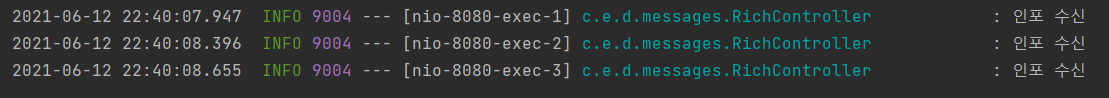 2021-06-12 23:35:49.720 INFO 2540 --- [nio-8080-exec-3] c.e.d.messages.RichController : 인포 수신
