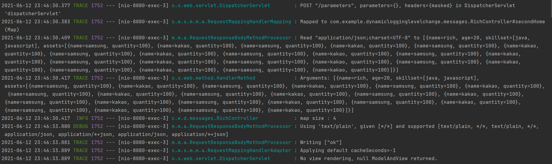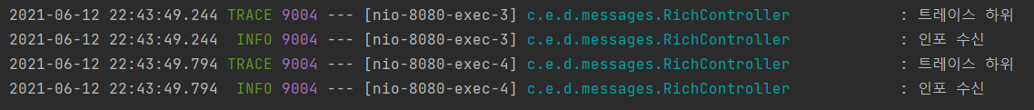 2021-06-12 23:02:30.430 TRACE 9004 --- [nio-8080-exec-7] c.e.d.messages.RichController : 트레이스 하위