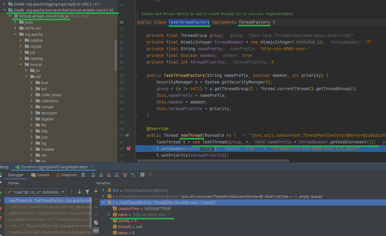 또한 여기에 브레이크 포인트를 거니까, 기동시에 톰캣에서 몇개의 스레드를 생성하는지도 확인할 수 있었다.