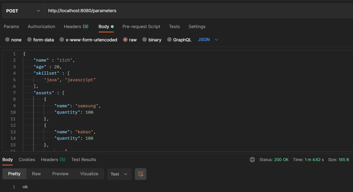 2021-06-12 23:40:55.074 TRACE 12596 --- [nio-8080-exec-2] m.m.a.RequestResponseBodyMethodProcessor : Read "application/json;charset=UTF-8" to [{name=rich, age=20, skillset=[java, javascript], assets=[{name=samsung, quantity=100}, {name=kakao, quantity=100}, {name=samsung, quantity=100}, {name=kakao, quantity=100}, {name=samsung, quantity=100}, {name=kakao, quantity=100}, {name=samsung, quantity=100}, {name=kakao, quantity=100}, {name=samsung, quantity=100}, {name=kakao, quantity=100}, {name=samsung, quantity=100}, {name=kakao, quantity=100}, {name=samsung, quantity=100}, {name=kakao, quantity=100}, {name=samsung, quantity=100}, {name=kakao, quantity=100}, {name=samsung, quantity=100}, {name=kakao, quantity=100}, {name=samsung, quantity=100}, {name=kakao, quantity=100}, {name=samsung, quantity=100}, {name=kakao, quantity=100}]}]