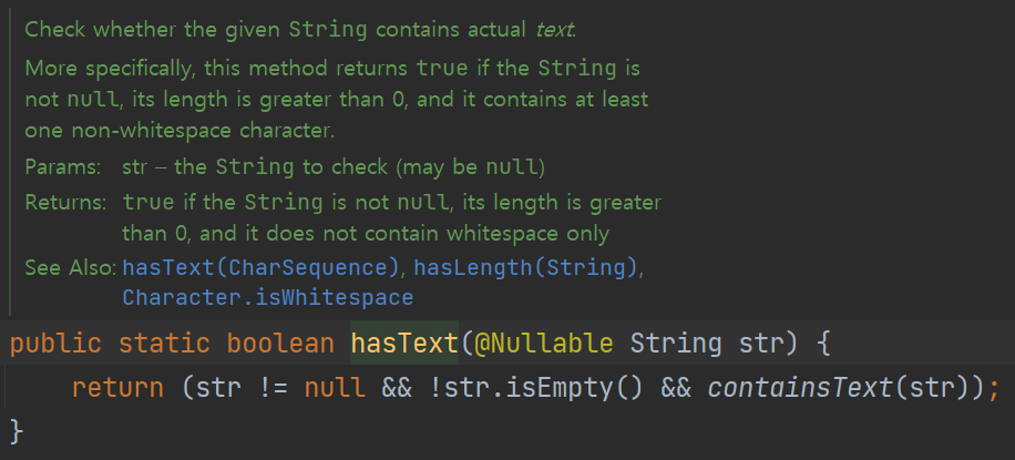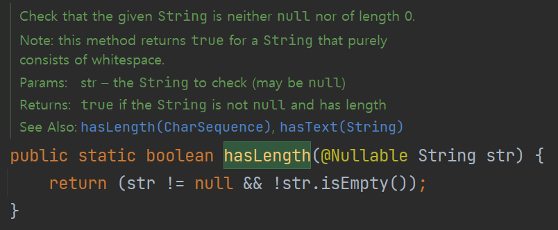StringUtils 클래스의 hasLength는 딱 그 null체크만 앞에 선행되는 메소드이다.
