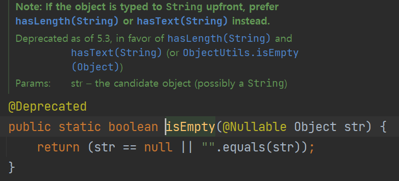 마침 StringUtils 클래스에도 똑같은 isEmpty() 메소드가 있어서 사용하려 했더니 Deprecated 되어있었다.