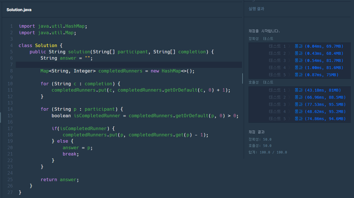 먼저 완주자 이름 String을 Key로, 사람 수 Integer를 Value로 하는 HashMap에 모든 완주자를 담았습니다.
