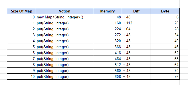 추가적으로 HashMap에 String과 Integer로 10개의 요소를 저장하면 필요한 메모리는 몇 바이트가 될지,