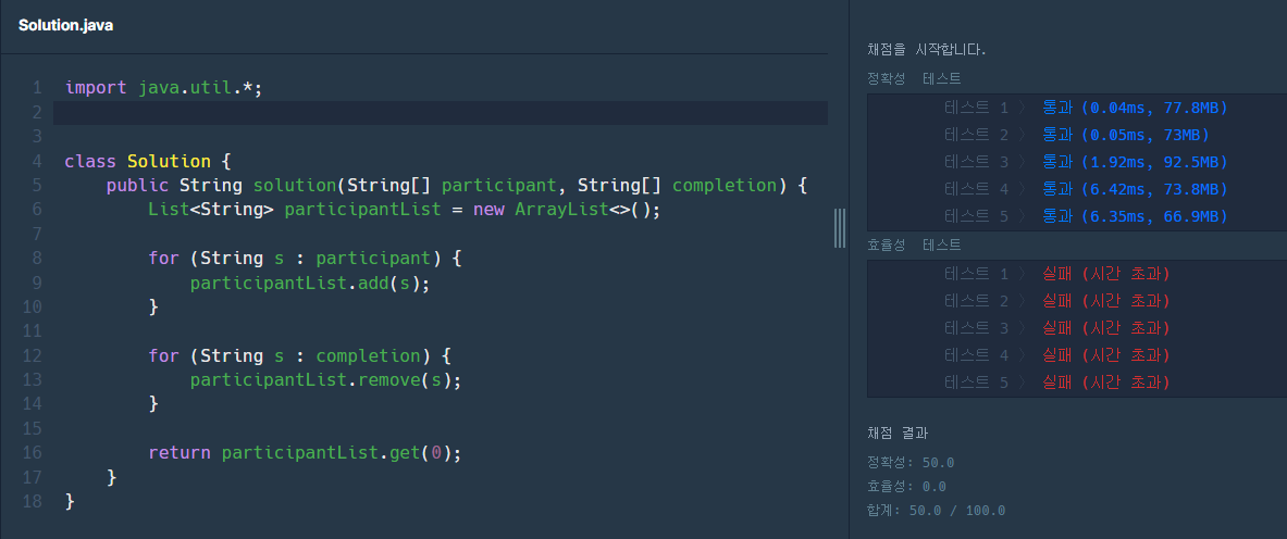 주석에 작성한대로, 완주자, 참가자 배열을 순회하는 코드는 각각 O(n),