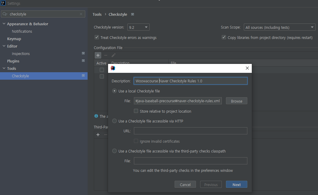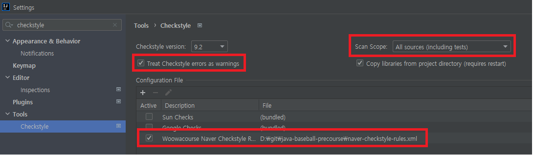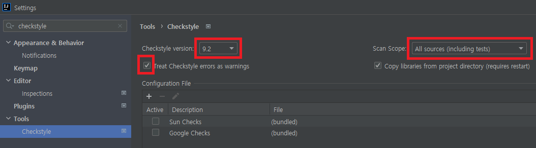Settings > Tools > Checkstyle 메뉴에 진입합니다.