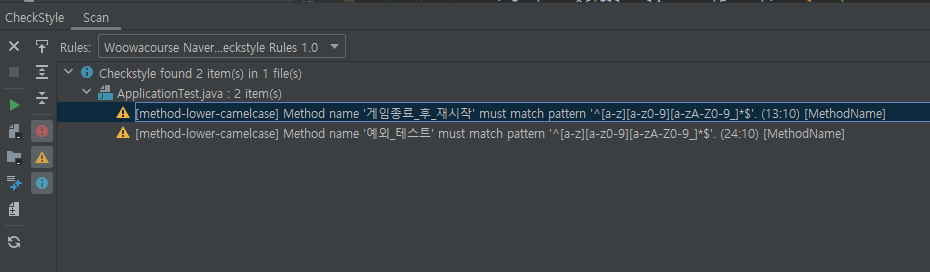 테스트 메소드 이름이 한글이어서 규약 위반이라고 나타난 부분을 제외한 모든 컨벤션 위반이 사라졌습니다.