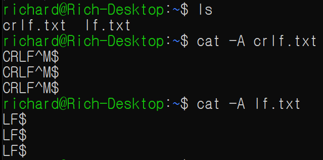 그리고 드디어 cat 명령어로 개행문자를 눈으로 확인할 수 있었습니다.