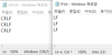 - Windows 는 CRLF를, Unix 계열은 LF를 새줄 문자 기본값으로 사용합니다.