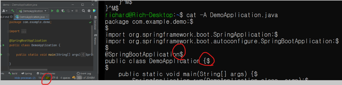 설정상으로도 LF로 표기되고, cat 명령어로 확인했을 때도 정상적으로 LF로 확인됩니다.