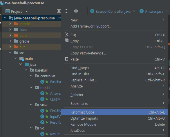 프로젝트 루트 디렉토리 우클릭 후 Reformat Code 선택