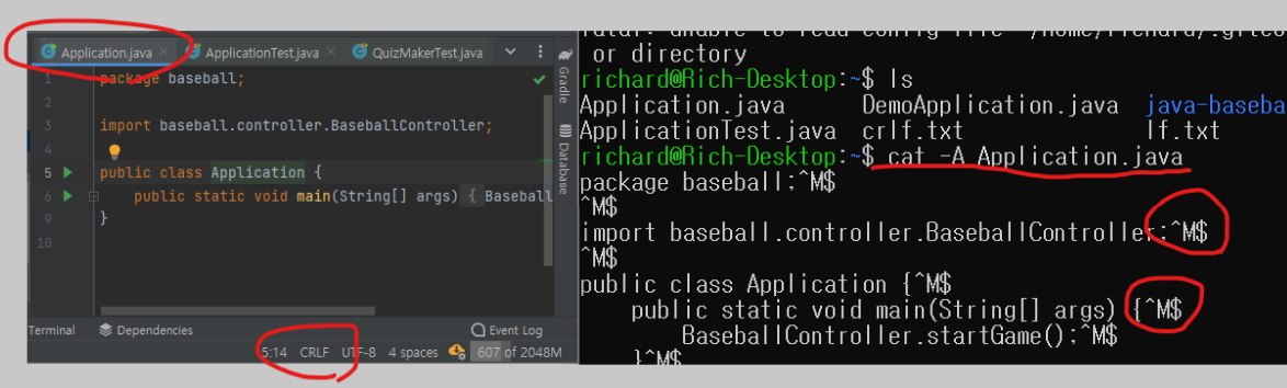 Answer.java의 파일 중간 새줄 문자와 파일 마지막 새줄 문자가 모두 CRLF로 되어있다는 모습입니다.