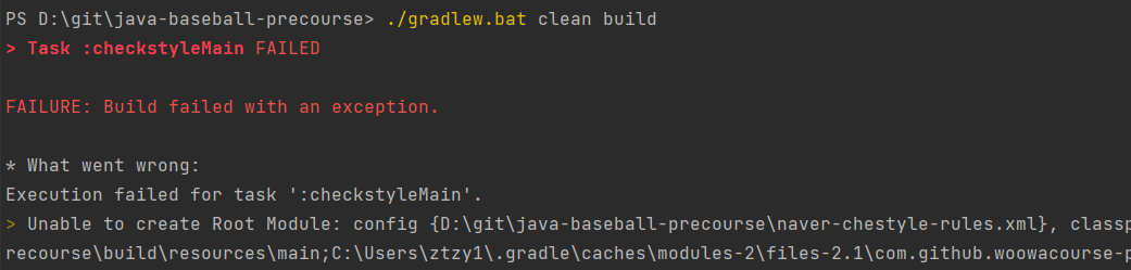checkstyleMain을 실행하는 중에 Root Module 생성에 실패했음을 확인했습니다.