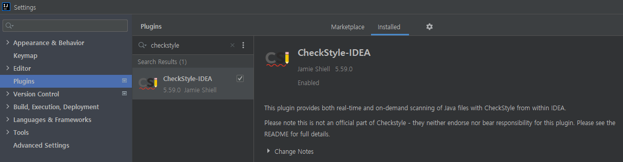 인텔리제이 플러그인을 설치합니다. CheckStyle-IDEA 입니다.