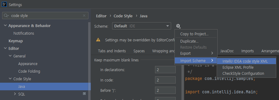 Code Style > Java 에 접근한 뒤, 톱니바퀴를 눌러 다운받은 파일을 선택합니다.