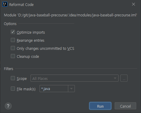 Optimize imports 체크 후 Run