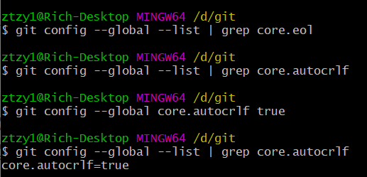 세번째줄은 autocrlf 설정을 true로 설정하는 모습이고,