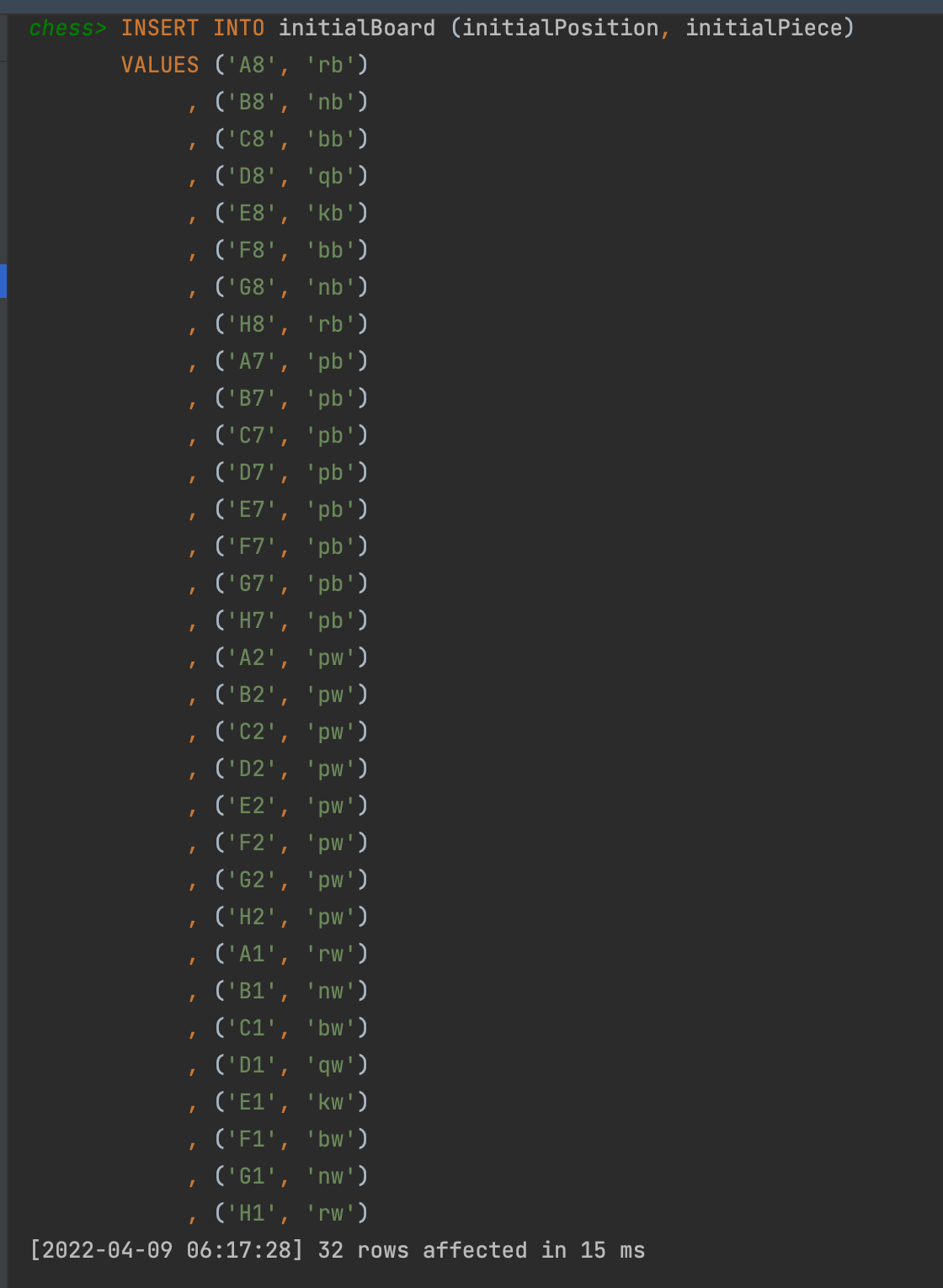 VALUES ('A8', 'rb') , ('B8', 'nb') , ('C8', 'bb') , ('D8', 'qb')