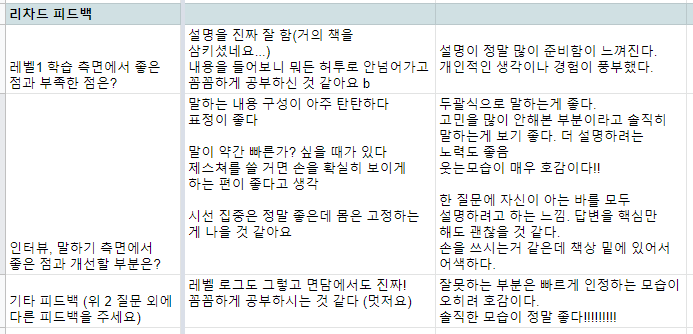 레벨 인터뷰가 끝난 뒤 도움이 될 것으로 기대되는 피드백들을 정리해서 전달했습니다.