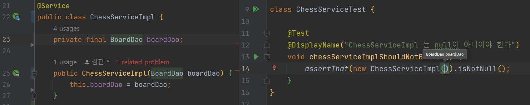 생성자 주입으로 BoardDao, GameDao 두 가지를 주입받도록 선언해둔 상태인데요,