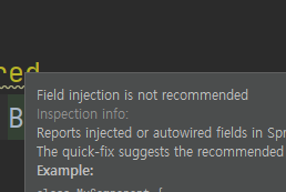 인텔리제이어서도 필드 주입은 권장하지 않는다고 이야기해줍니다.