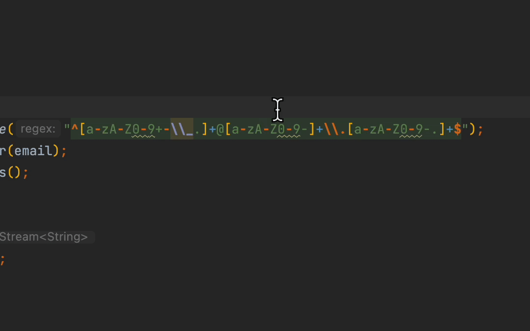 이메일 정규식 이라는 키워드로 검색해서 얻은 정규표현식 문자열을 인텔리제이에 붙여넣기 해보았습니다.