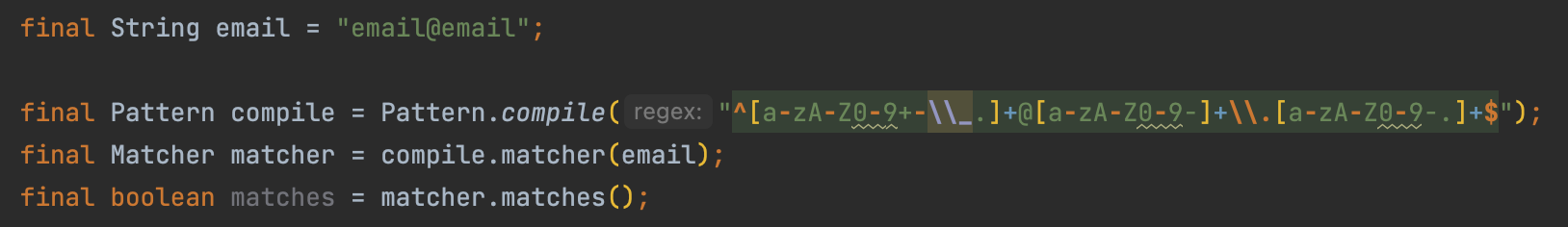 정규식 위에 선언된 String email의 문자열이 모두 초록색으로 표기된 것과 달리,