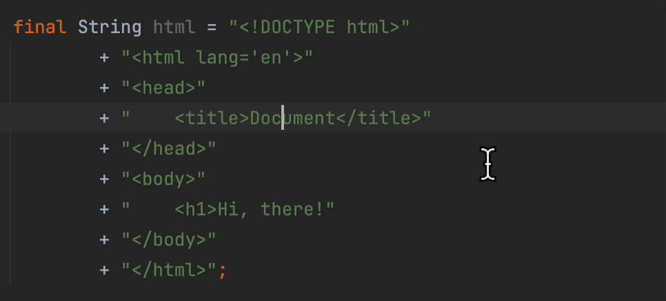 HTML 형식의 문자열을 Java 코드에서 다룰 때, 하이라이팅 지원을 받을 수 있습니다.