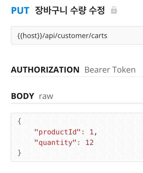 - 아래 사진은 장바구니 미션에서 사용했던 수량 수정 API 인데요,