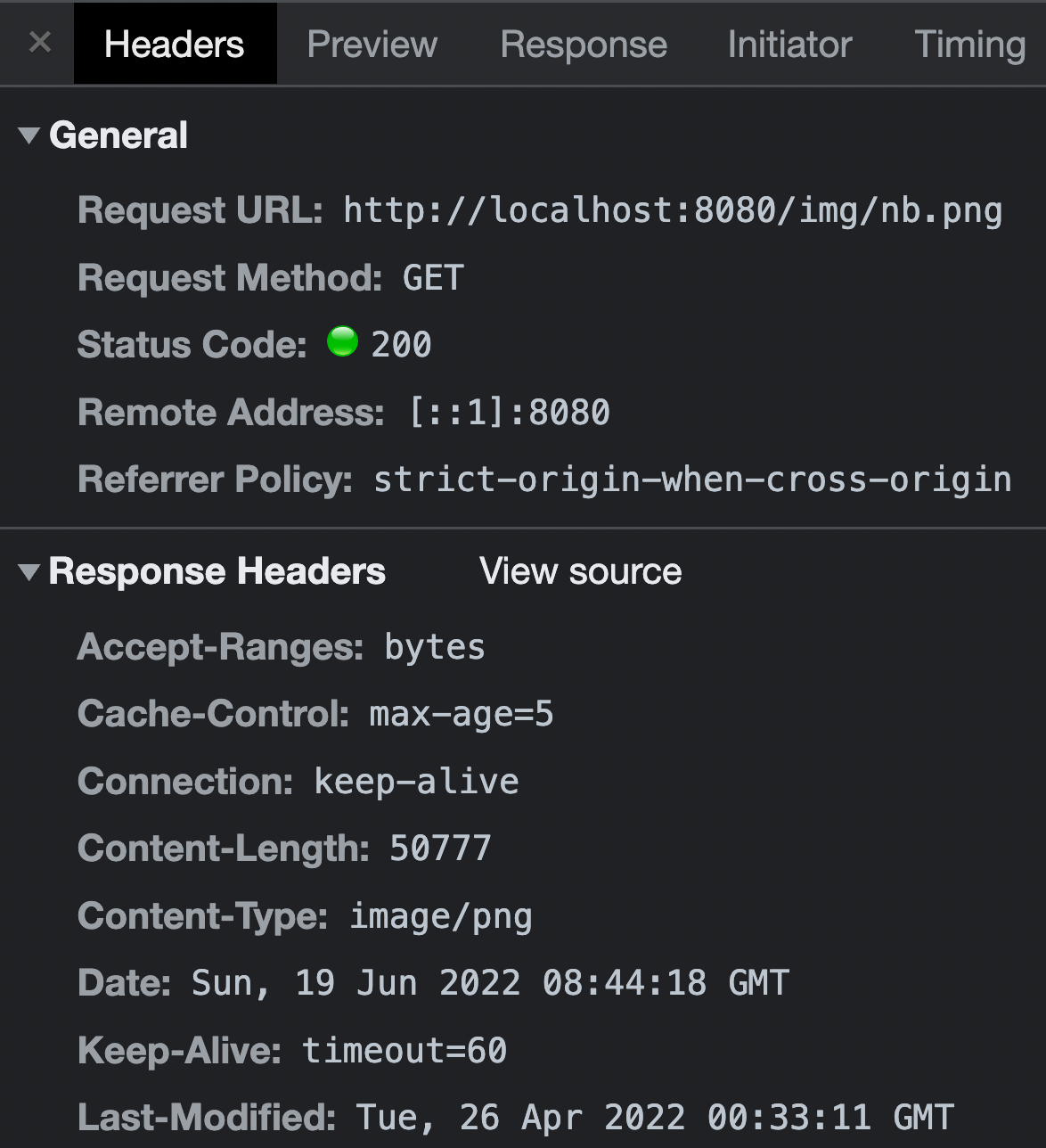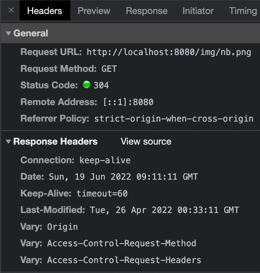 최초 응답은 이미지를 포함해서 50kb 였는데, 304 응답은 body가 필요없기에 약 0.2kb 밖에 되지 않습니다.