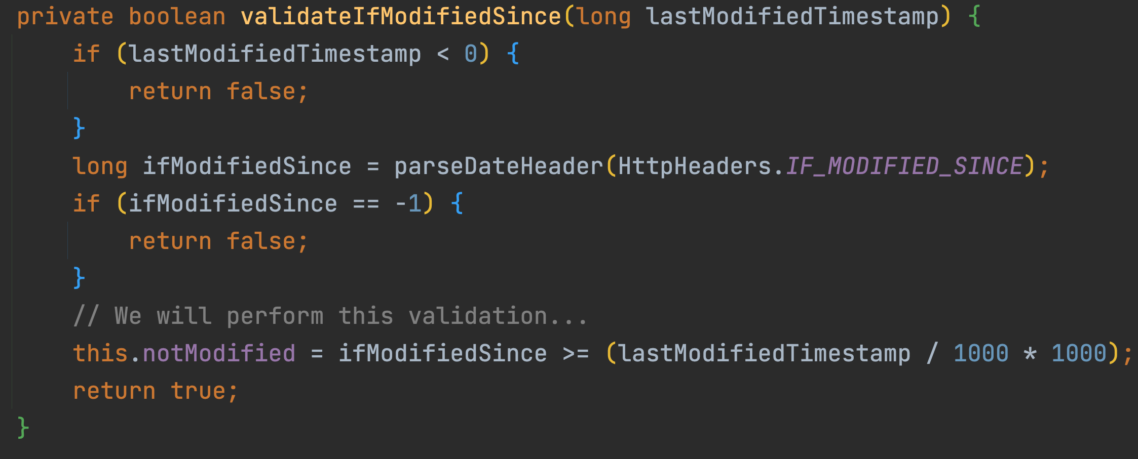 - 스프링은 정적 리소스에 대한 응답 시, 자동으로 파일 시스템의 최종 수정시간을 Last-Modified에 담아 보낸다