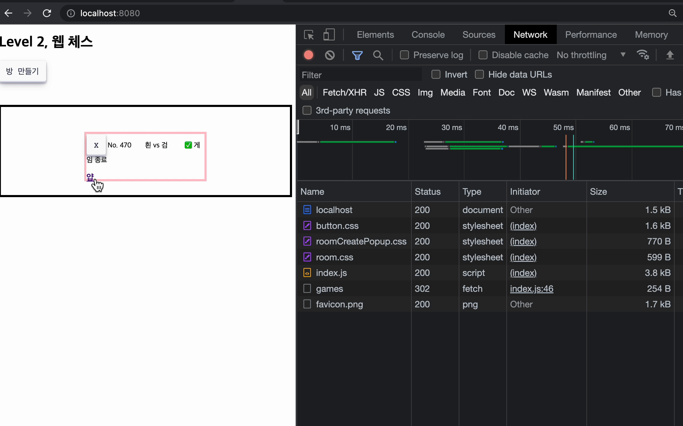 방 목록으로 나갔다가 다시 체스 방에 입장했을 땐 Size 탭에 용량이 아닌 (memory cache) 라고 표기됩니다.