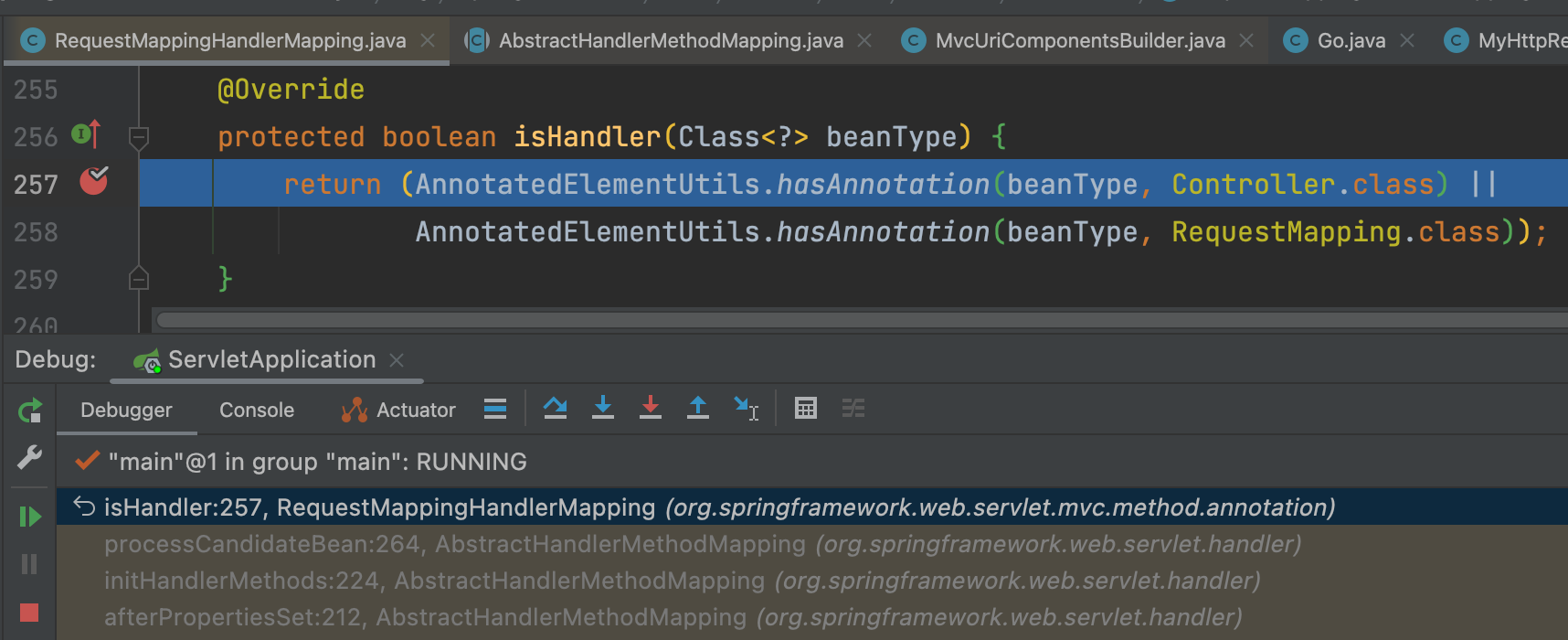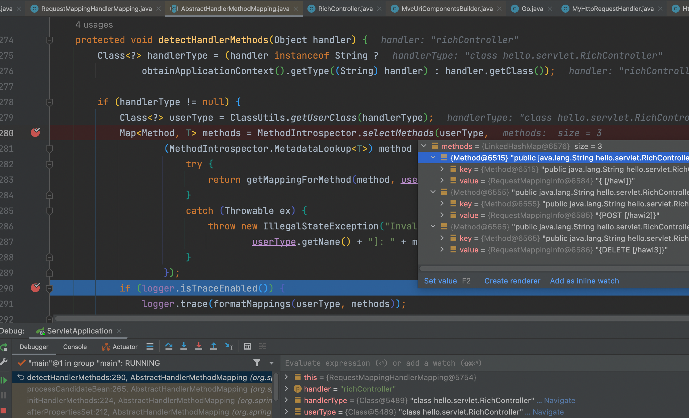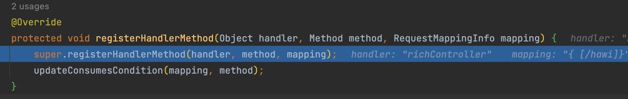 실제로 하나의 컨트롤러 클래스에 선언된 여러 개의 핸들러들이 등록되는 곳을 디버그로 확인해봤습니다.