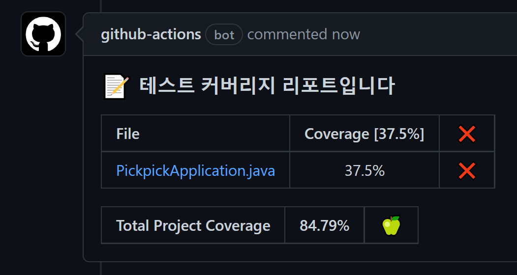 해당 커버리지를 넘지 못하는 클래스가 있을 경우 코멘트로 리포트해줍니다.