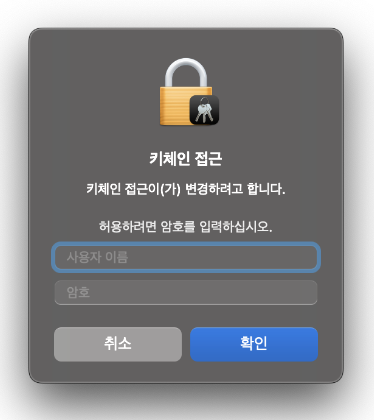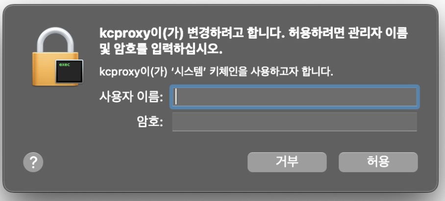 - 키체인 접근, kcproxy 관련 모두 맥북 잠금 해제할 때 사용되는 이름, 비밀번호를 입력하면 됨