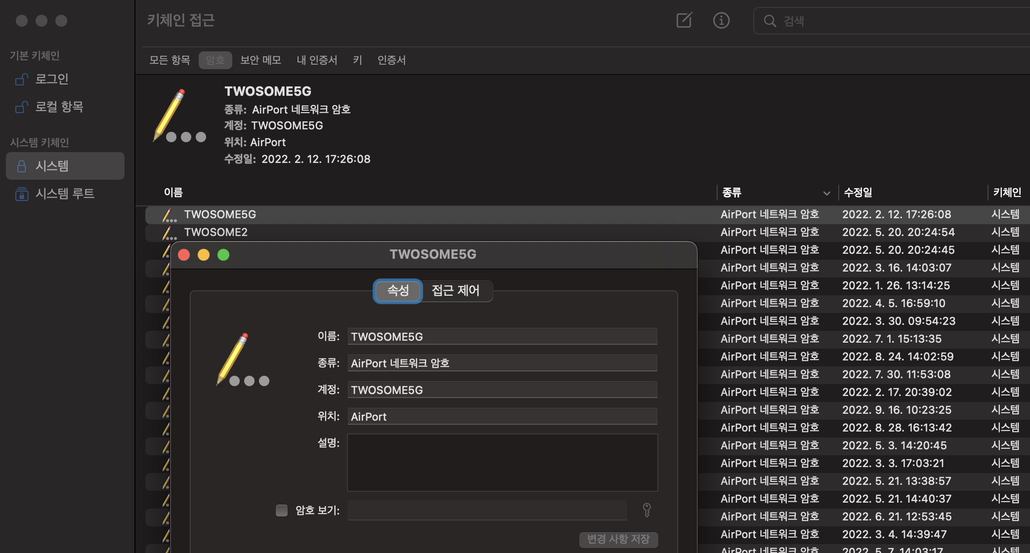 시스템 키체인 -> 시스템 -> AirPort 네트워크 암호 중 더블클릭