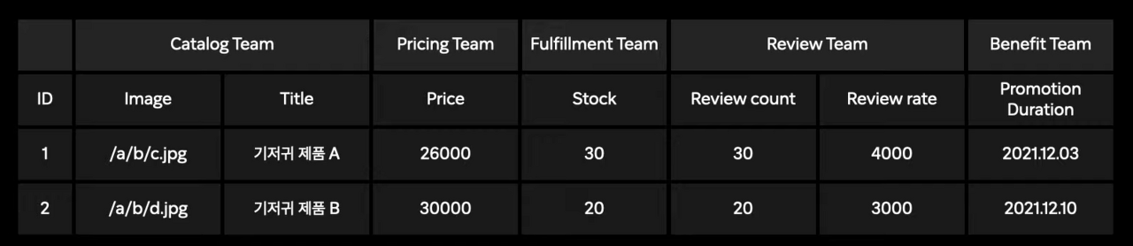 개발 도메인에서 각각의 컬럼에 해당하는 데이터를 담당하여 한 곳에서 완성되는 식입니다.