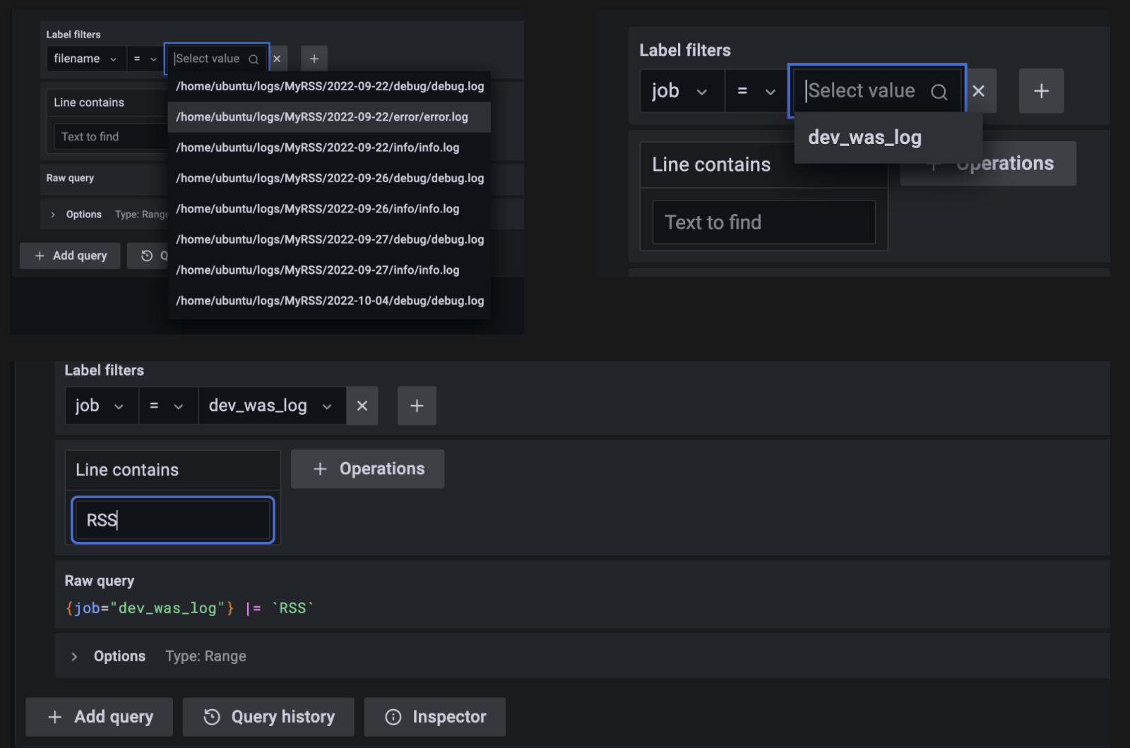 그 뒤에 job 별로, filename 별로 로그를 쿼리할 수 있습니다.