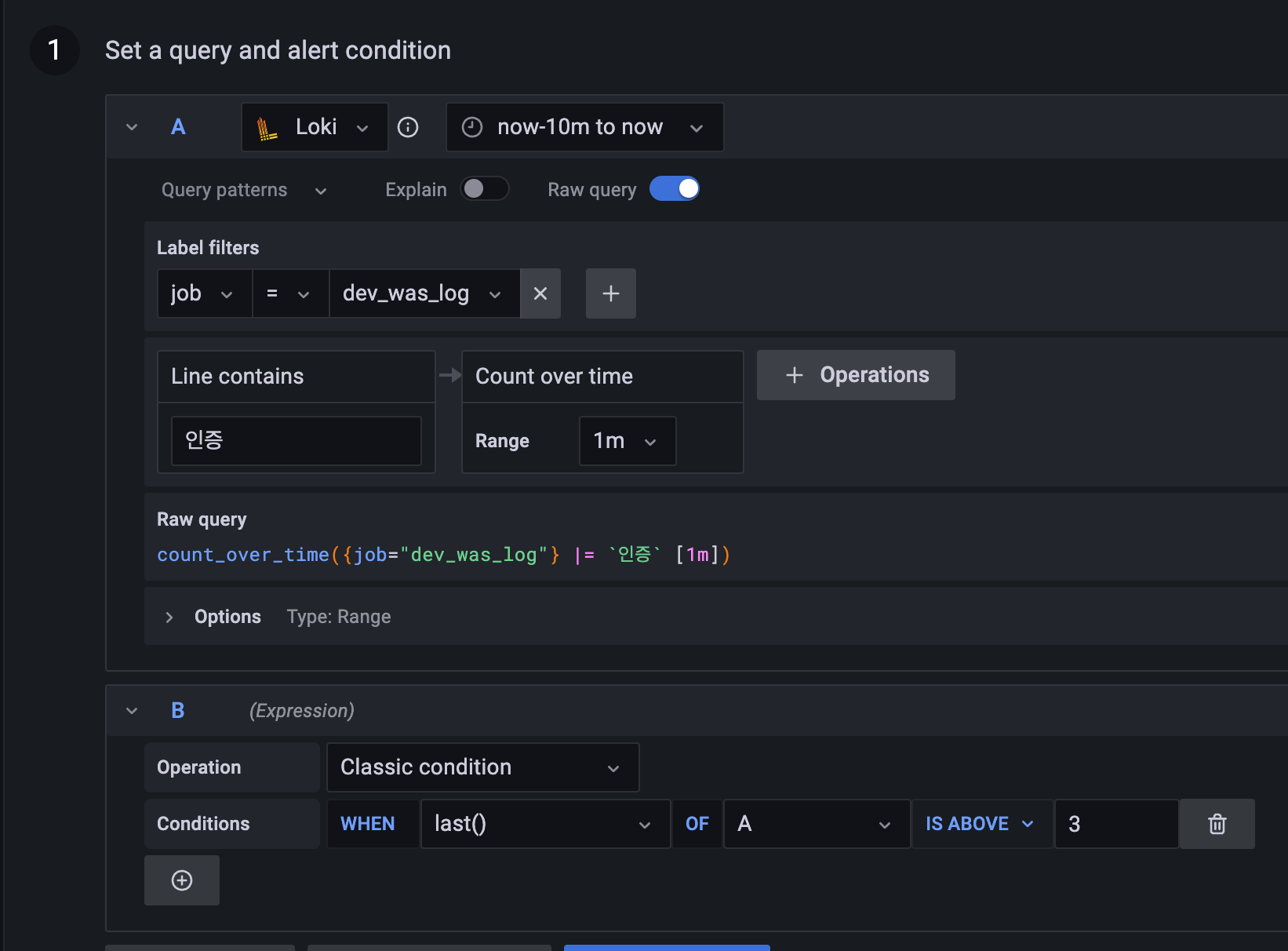 즉 1분 마다 최근 1분 동안 발생한 개발서버 로그에서 인증이라는 문자가 3개를 초과하는지 체크하고,
