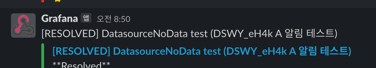 알림 발생 사유가 존재했다가 5분 이후에 해소되었다면 알림에 RESOLVED로 전송됩니다.