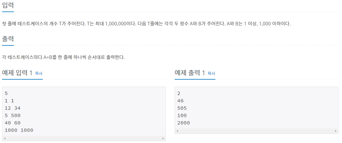 첫 줄에 테스트케이스의 개수 T가 주어진다. T는 최대 1,000,000이다. 다음 T줄에는 각각 두 정수 A와 B가 주어진다. A와 B는 1 이상, 1,000 이하이다.