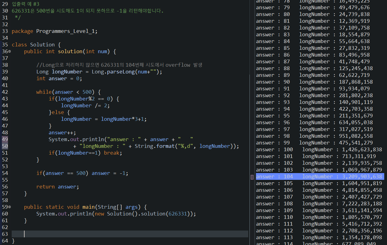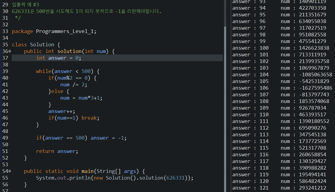 626331은 500번을 시도해도 1이 되지 못하므로 -1을 리턴해야합니다.