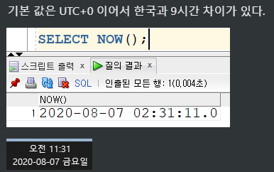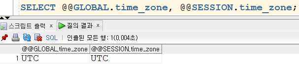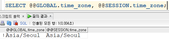 SELECT @@GLOBAL.time_zone, @@SESSION.time_zone; <!-- 타임존 설정을 볼 수 있다.-->