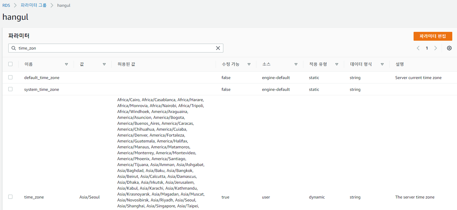 파라미터 그룹을 클릭한 후 나오는 화면에서 time_zone을 검색합니다.